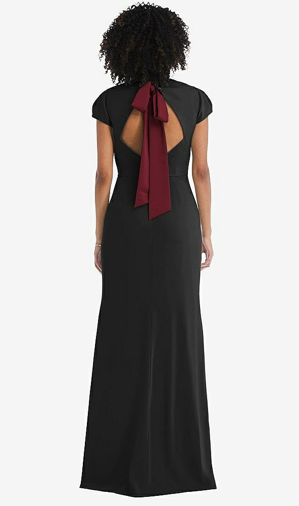 Back View - Black & Cabernet Puff Cap Sleeve Cutout Tie-Back Trumpet Gown