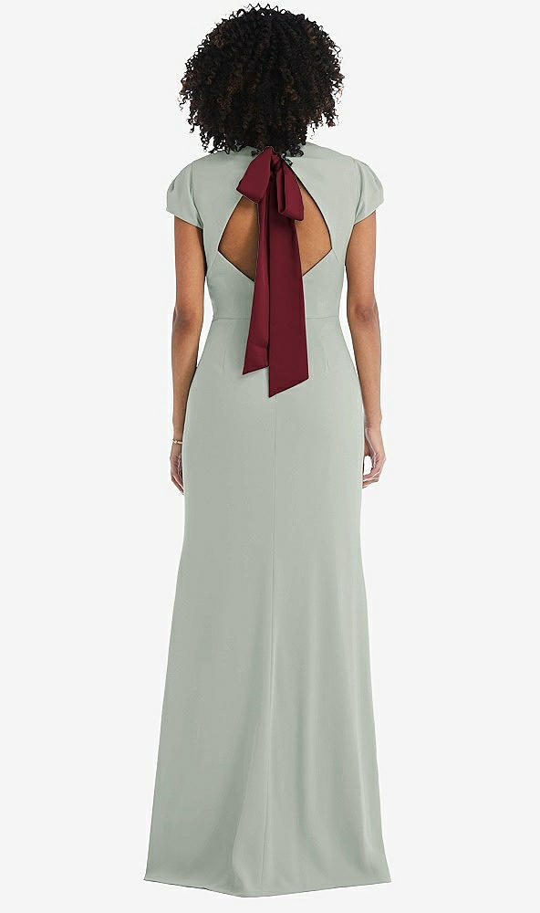Rear View Thumbnail - Willow Green & Cabernet Puff Cap Sleeve Cutout Tie-Back Trumpet Gown