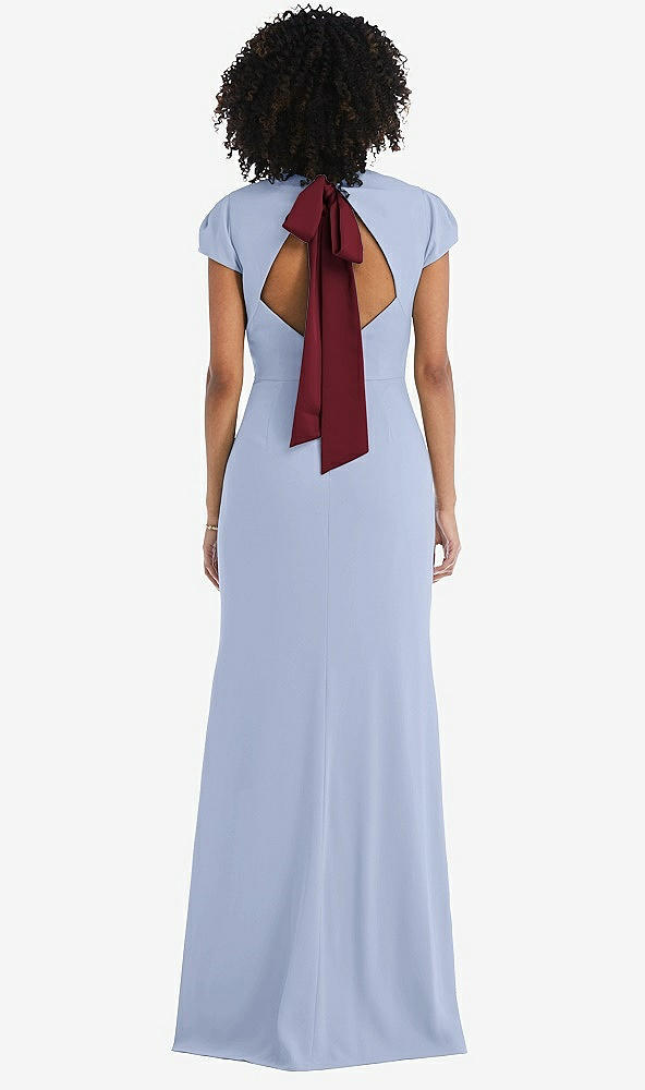 Rear View Thumbnail - Sky Blue & Cabernet Puff Cap Sleeve Cutout Tie-Back Trumpet Gown