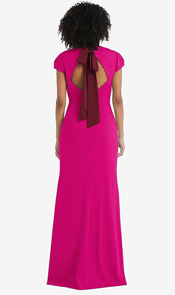 Back View - Think Pink & Cabernet Puff Cap Sleeve Cutout Tie-Back Trumpet Gown