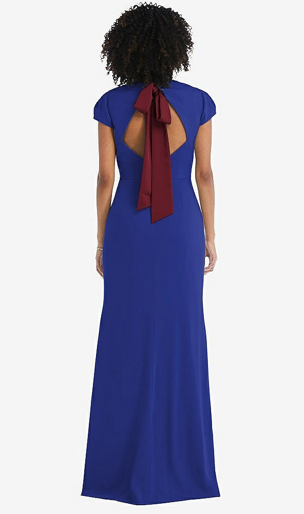 Shaped to flatter, this crepe maxi dress features a modified trumpet skirt complete with a front slit that lends a flirty touch. The jewel neckline and puff cap sleeve offer a contemporary look, while the open back, complete with a silk-like lux charmeuse scarf holds the neckline in place. Choose this elegant dress from several color combinations to make it uniquely yours.