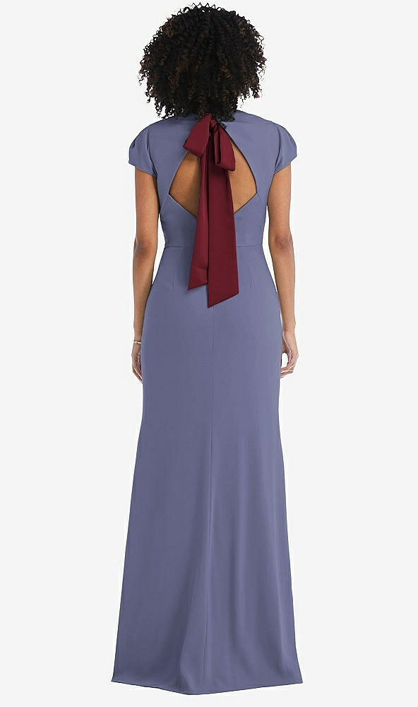 Back View - French Blue & Cabernet Puff Cap Sleeve Cutout Tie-Back Trumpet Gown