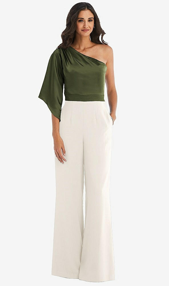 Front View Thumbnail - Ivory & Olive Green One-Shoulder Bell Sleeve Jumpsuit with Pockets