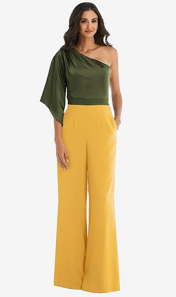 Front View Thumbnail - NYC Yellow & Olive Green One-Shoulder Bell Sleeve Jumpsuit with Pockets