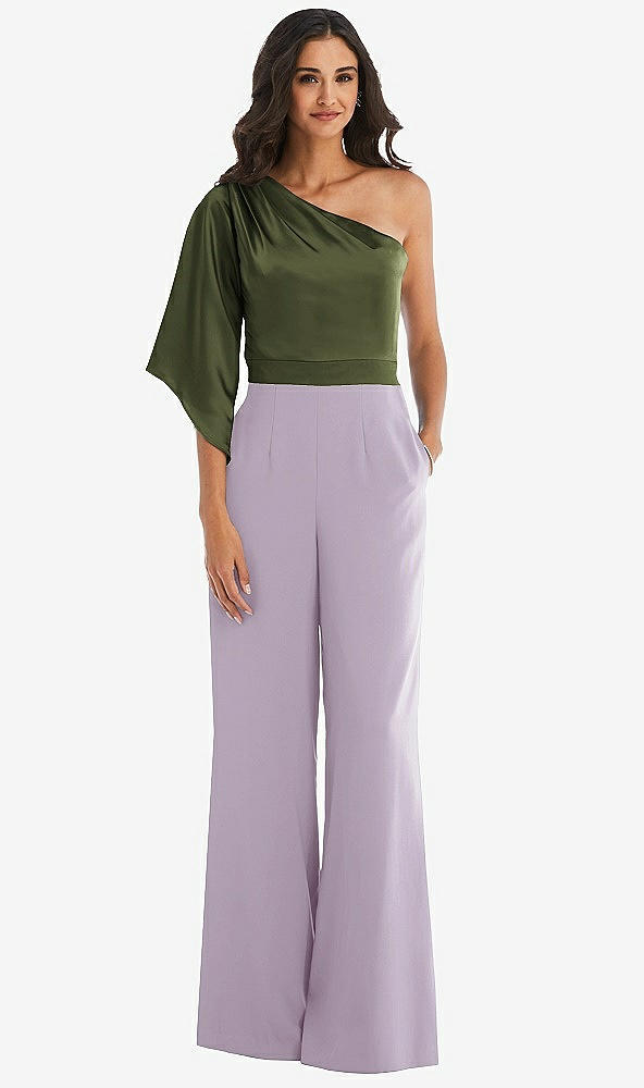 Front View - Lilac Haze & Olive Green One-Shoulder Bell Sleeve Jumpsuit with Pockets