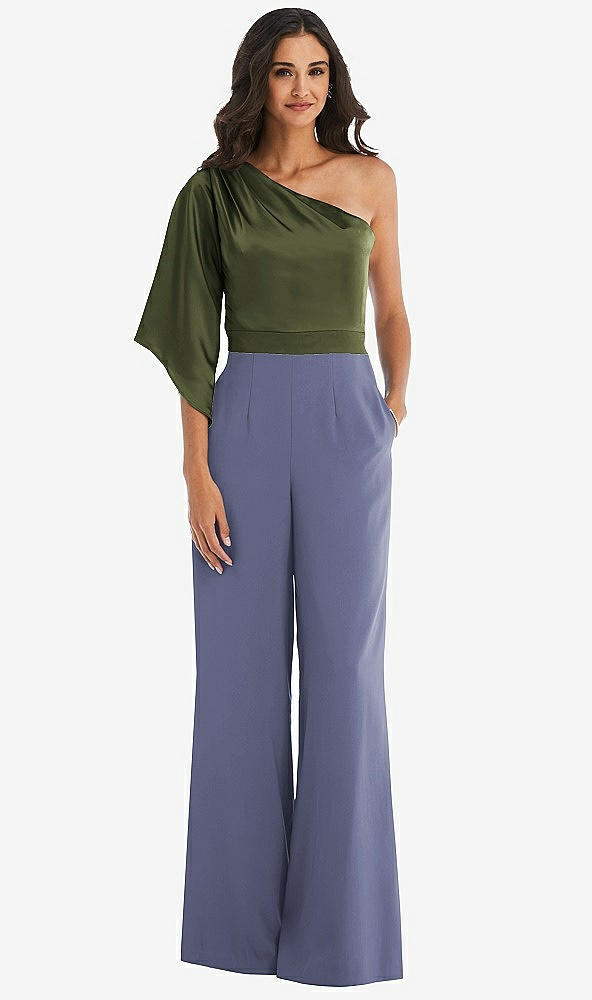 Front View - French Blue & Olive Green One-Shoulder Bell Sleeve Jumpsuit with Pockets
