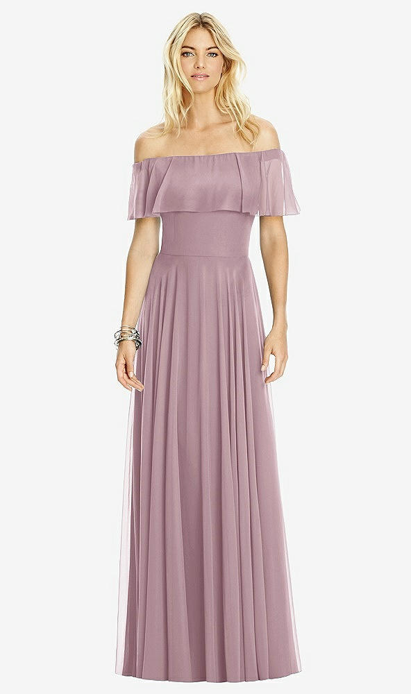 Winsomely romantic, this dreamy off the shoulder dress is simply ethereal with a delicate ruffle overlay. Flowing wistfully in swirls and swishes, the lux chiffon and circle skirt gracefully glides down the aisle.