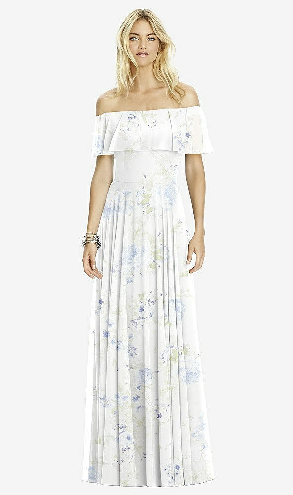 Winsomely romantic, this dreamy off the shoulder dress is simply ethereal with a delicate ruffle overlay. Flowing wistfully in swirls and swishes, the lux chiffon and circle skirt gracefully glides down the aisle.