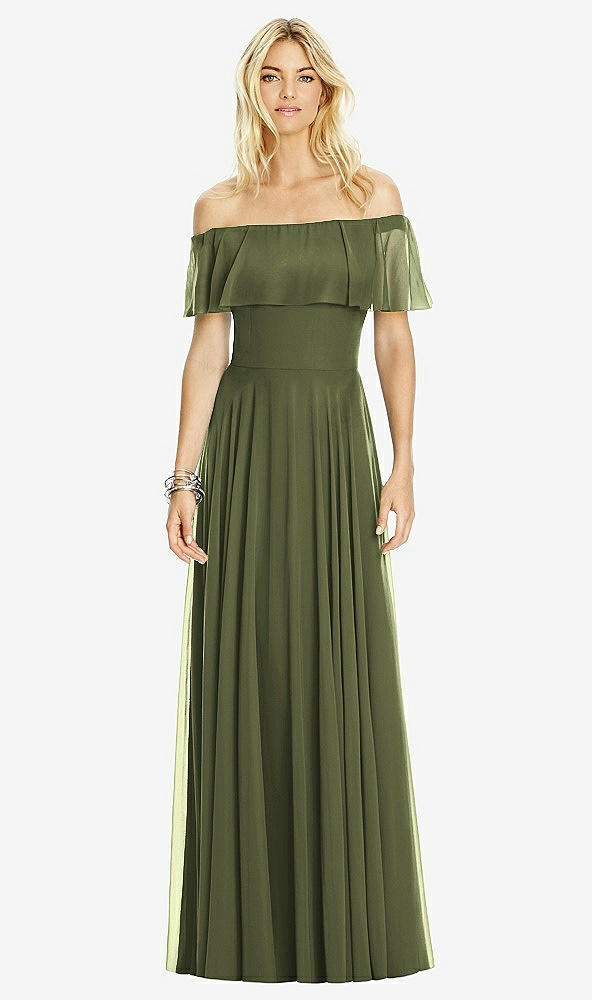 Winsomely romantic, this dreamy off the shoulder dress is simply ethereal with a delicate ruffle overlay. Flowing wistfully in swirls and swishes, the lux chiffon and circle skirt gracefully glides down the aisle.