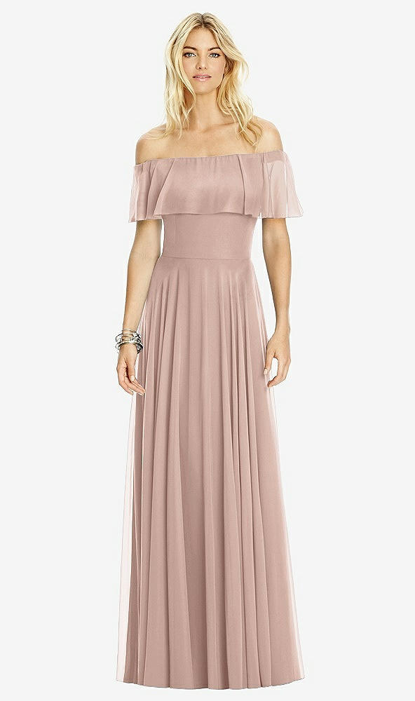 Winsomely romantic, this dreamy off the shoulder dress is simply ethereal with a delicate ruffle overlay. Flowing wistfully in swirls and swishes, the lux chiffon and circle skirt gracefully glides down the aisle.