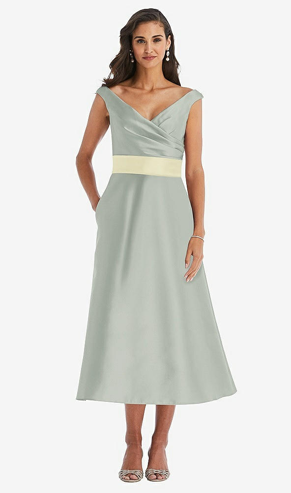 Off-the-Shoulder Draped Wrap Satin Midi Dress with Pockets in Willow Green & Butter Yellow