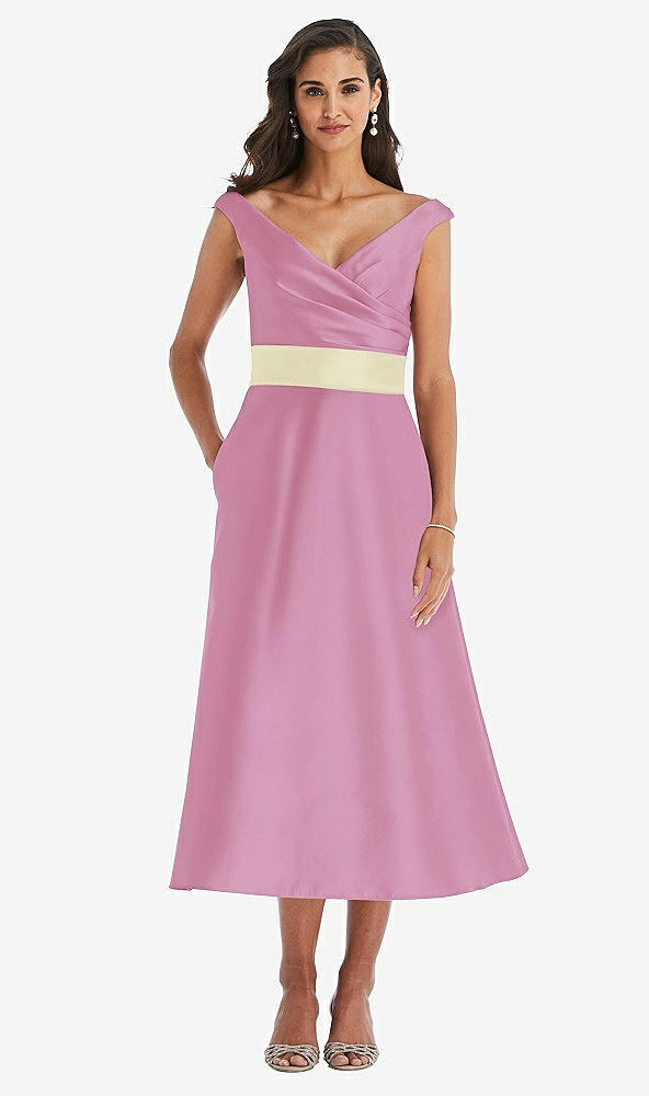 Off-the-Shoulder Draped Wrap Satin Midi Dress with Pockets in Powder Pink & Butter Yellow