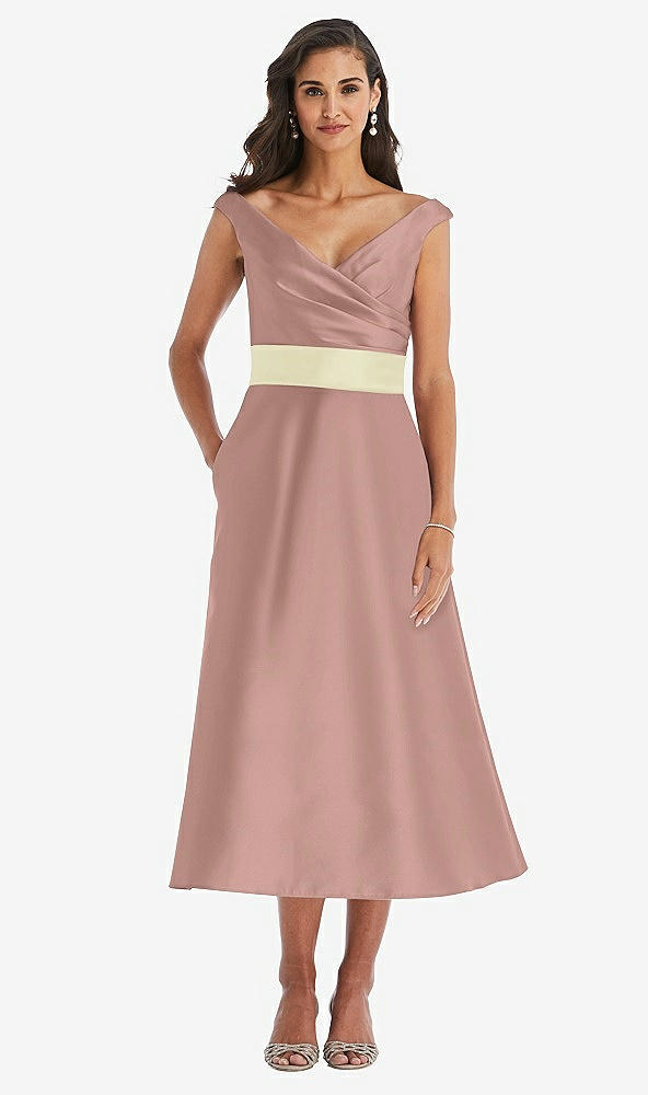 Off-the-Shoulder Draped Wrap Satin Midi Dress with Pockets in Neu Nude & Butter Yellow