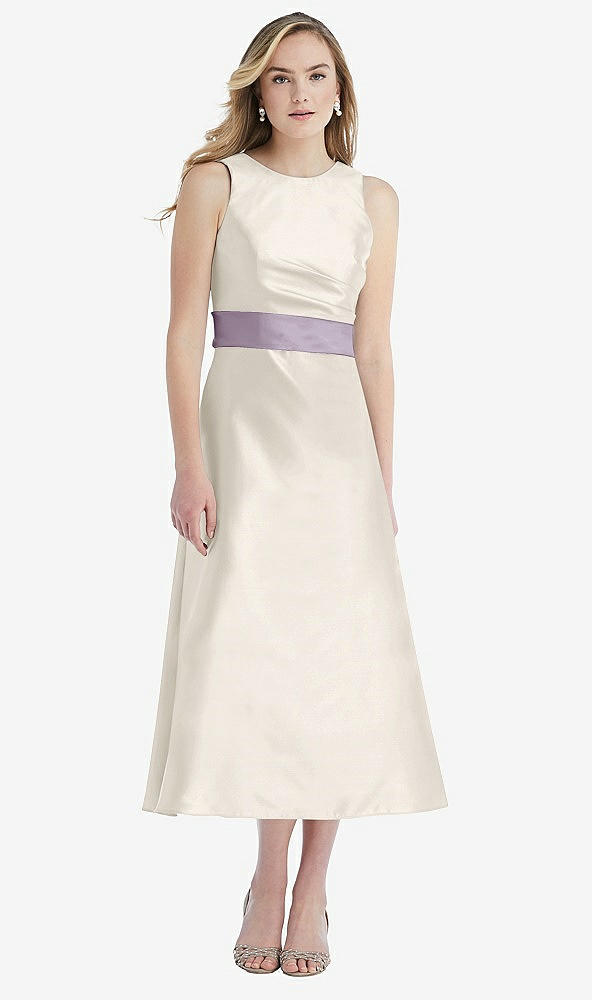 Front View Thumbnail - Ivory & Lilac Haze High-Neck Asymmetrical Shirred Satin Midi Dress with Pockets