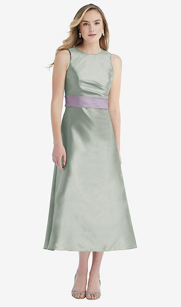 High-Neck Asymmetrical Shirred Satin Midi Dress with Pockets in Willow Green & Lilac Haze