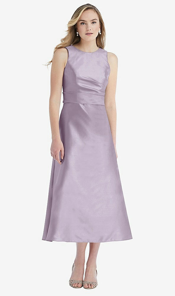 High-Neck Asymmetrical Shirred Satin Midi Dress with Pockets in Lilac Haze & Lilac Haze