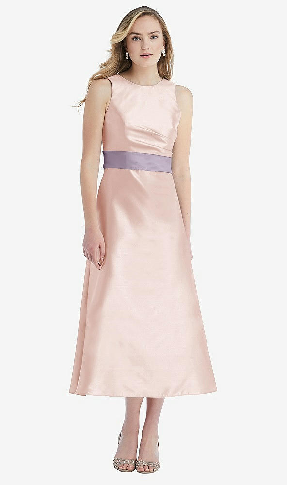 Front View Thumbnail - Blush & Lilac Haze High-Neck Asymmetrical Shirred Satin Midi Dress with Pockets
