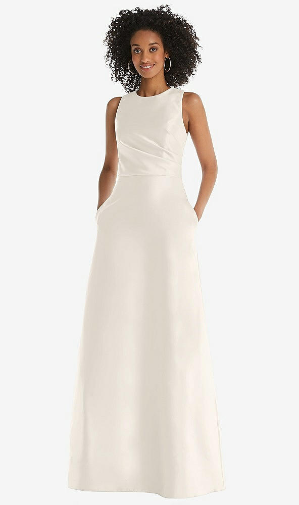 Tastefully timeless and stylishly simple, this high neck satin twill maxi dress lends itself elegantly to evening affairs. This gown features a full A-line skirt with pockets, low v-back, and asymmetrical shirred detail at the bodice.