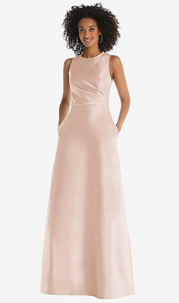 Jewel Neck Asymmetrical Shirred Bodice Maxi Dress with Pockets in Cameo