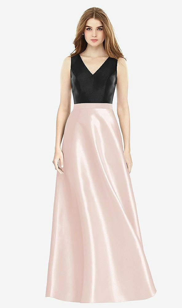 A flattering silhouette with v-necklines in front and back defines the form of this full-length sleeveless satin twill dress. Side pockets and a waist at its natural front add livability to an expressive, elegant style. Available in any color combination satin twill bodice and skirt or as solid.
