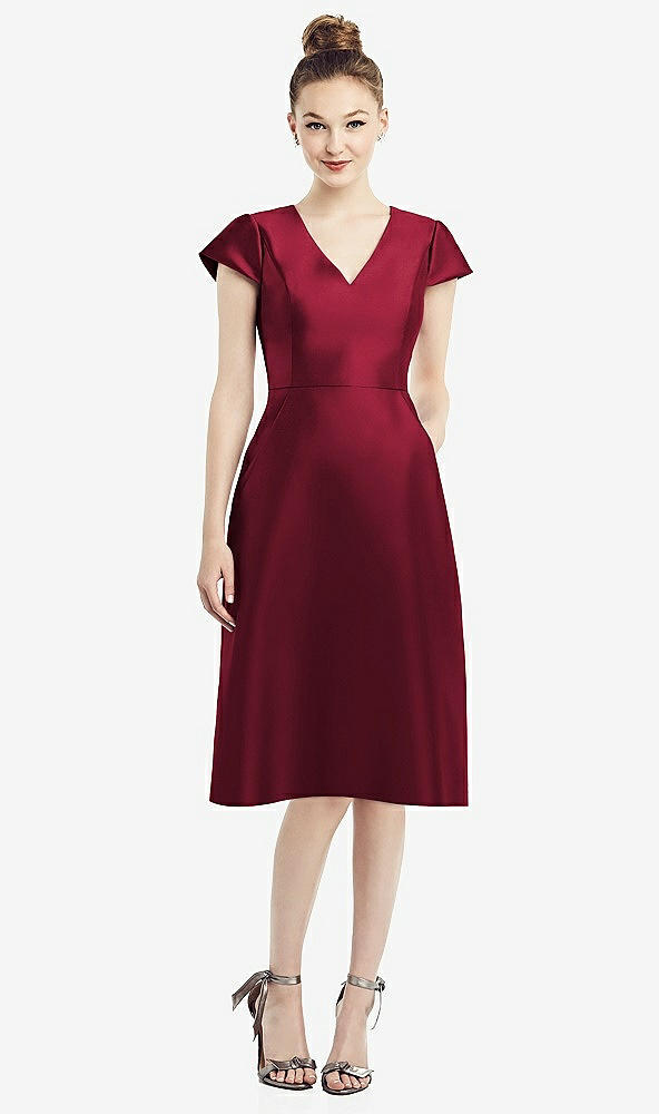 Cap Sleeve V-Neck Satin Midi Dress with Pockets in Burgundy