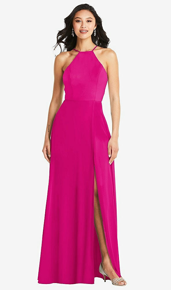 You'll look stunning in this flowy and flirty halter maxi dress. This gorgeous chiffon gown flaunts a modified circle skirt with a front slit and shoulder-baring spaghetti straps to show off just the right amount of skin.