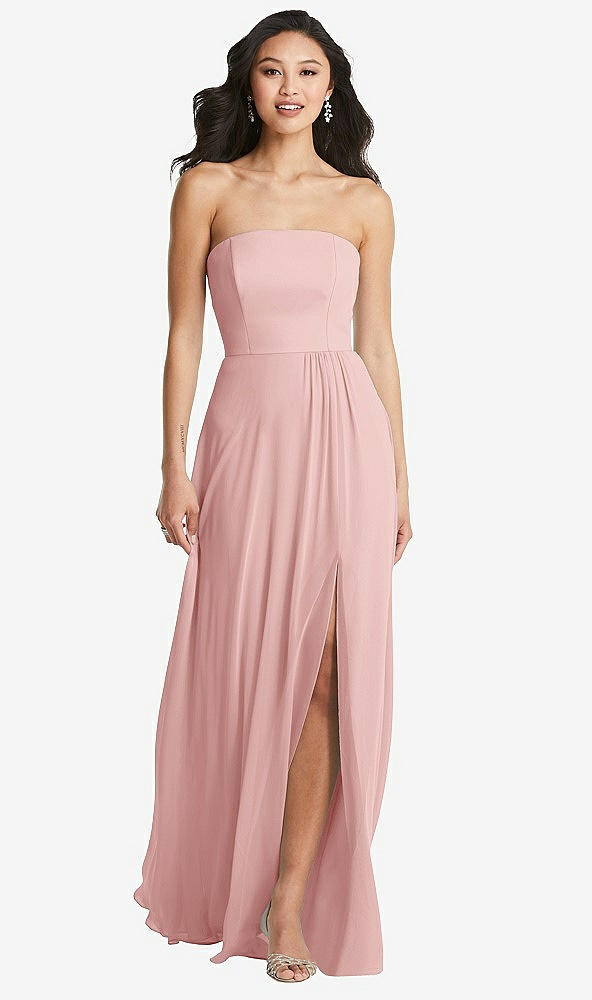 This chic, strapless dress is equal parts daring and elegant, showcasing a slit with shirred detailing on a flowy modified circle skirt. Crafted of delicate lux chiffon, the design is enhanced by a tasteful and flattering silhouette.