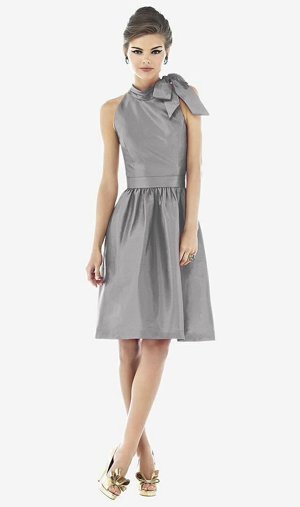 Cocktail length sleeveless dupioni dress with bow at high neck. Matching 1.75 self belt at natural waist. Full shirred skirt has pockets at side seams. Also available full length as style D533.