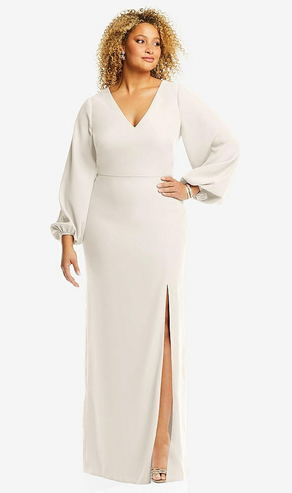 Long Puff Sleeve V-Neck Trumpet Gown in Ivory