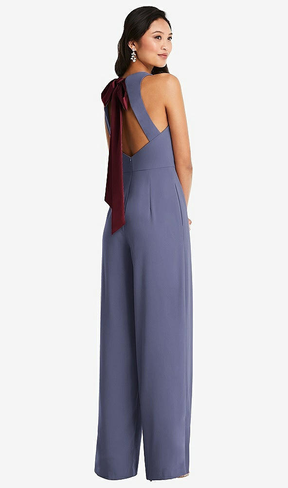 Back View - French Blue & Cabernet Cutout Open-Back Halter Jumpsuit with Scarf Tie