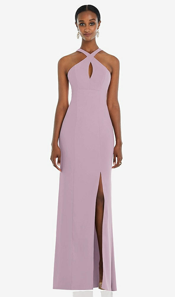 Be the belle of the ball with this formal princess line dress and its gorgeous crepe fabric. Draping beautifully, a trumpet skirt and crisscross halter neckline adds detail and elegance to your ensemble. A slit to mid-though and a low back complete the look with a hint of sensuality.
