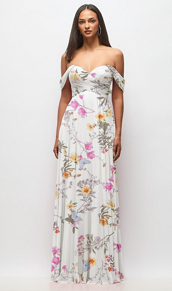 Off-the-Shoulder Draped Chiffon Maxi Dress in Butterfly Botanica Ivory