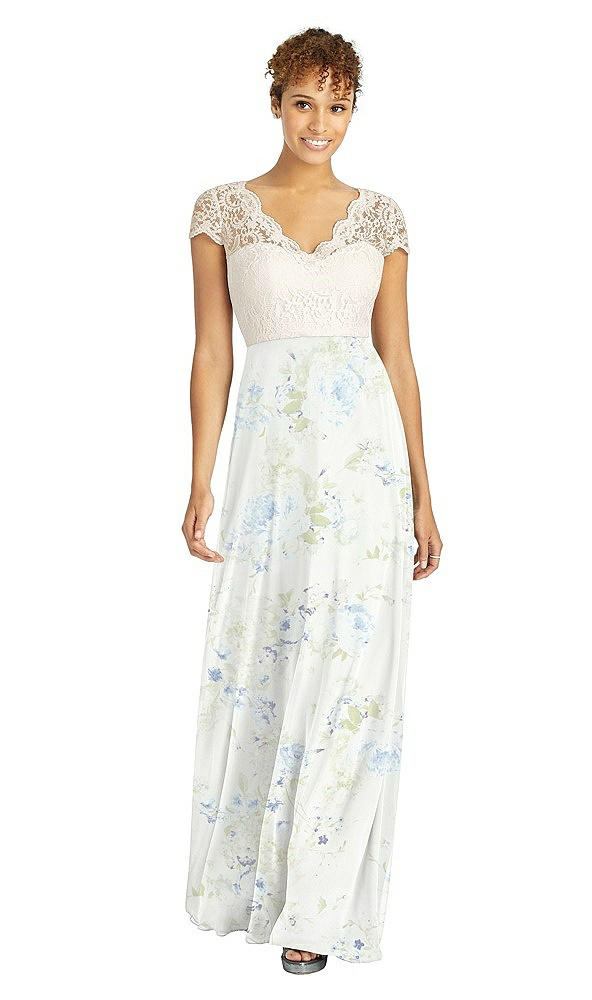 Front View - Bleu Garden & Ivory Cap Sleeve Illusion-Back Lace and Chiffon Dress