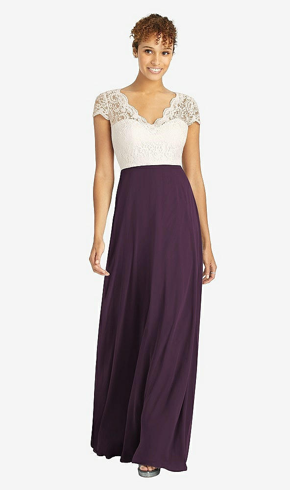 Front View - Aubergine & Ivory Cap Sleeve Illusion-Back Lace and Chiffon Dress
