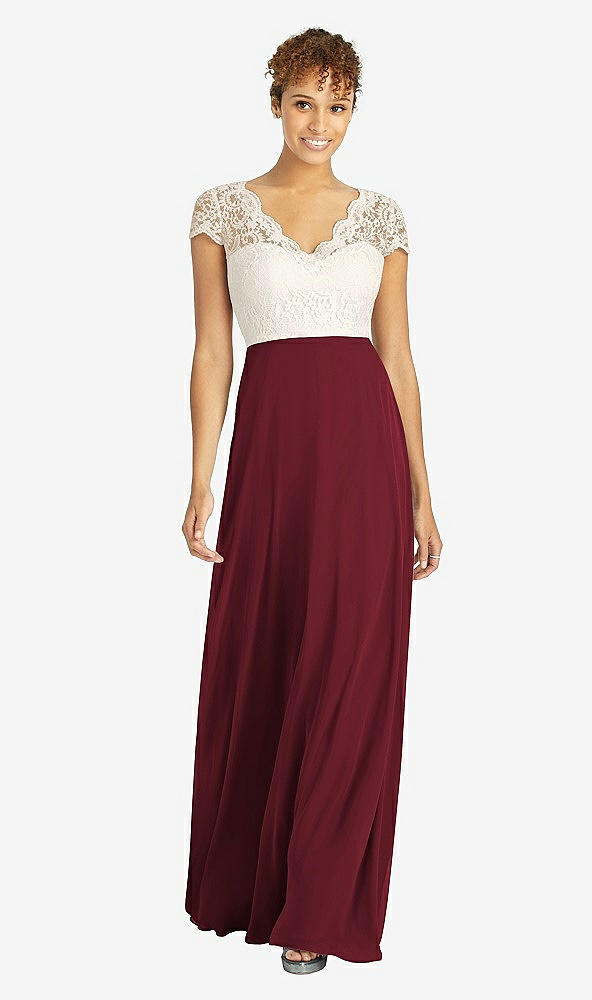 Cap Sleeve Illusion-Back Lace and Chiffon Dress in Cabernet & Ivory