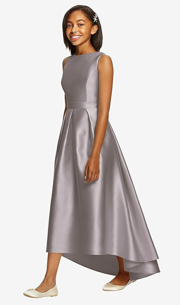 An elegant profile offers stylish ambiance and a flattering fit in this full-length sleeveless satin twill junior bridesmaid dress. A bateau neckline and hi-low hem deliver intriguing details, while an open back, self belt, and pockets at its side seams sew up an elegant package.