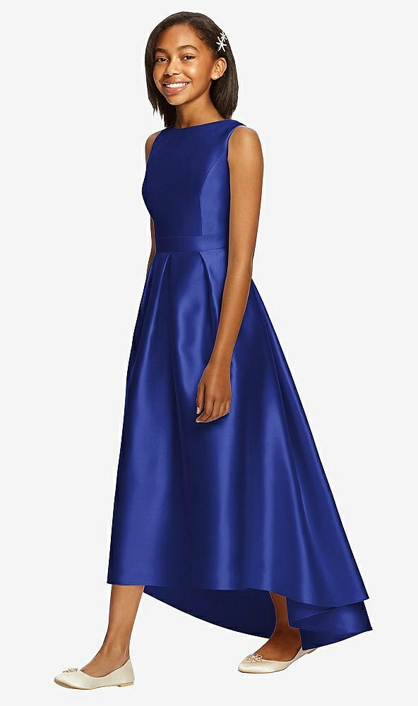 An elegant profile offers stylish ambiance and a flattering fit in this full-length sleeveless satin twill junior bridesmaid dress. A bateau neckline and hi-low hem deliver intriguing details, while an open back, self belt, and pockets at its side seams sew up an elegant package.