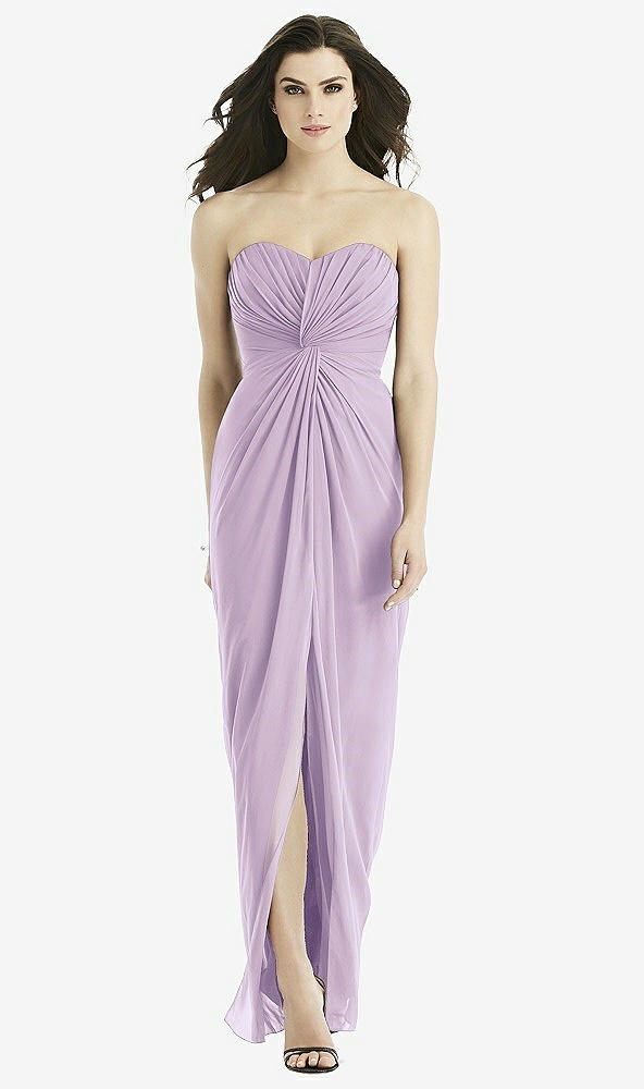 Style and comfort unite with the elegant twist front draped detail on this strapless lux chiffon bridesmaid dress. Gathering on the bodice and full-length column skirt complete a balanced look, diversified with a slit at the center front.