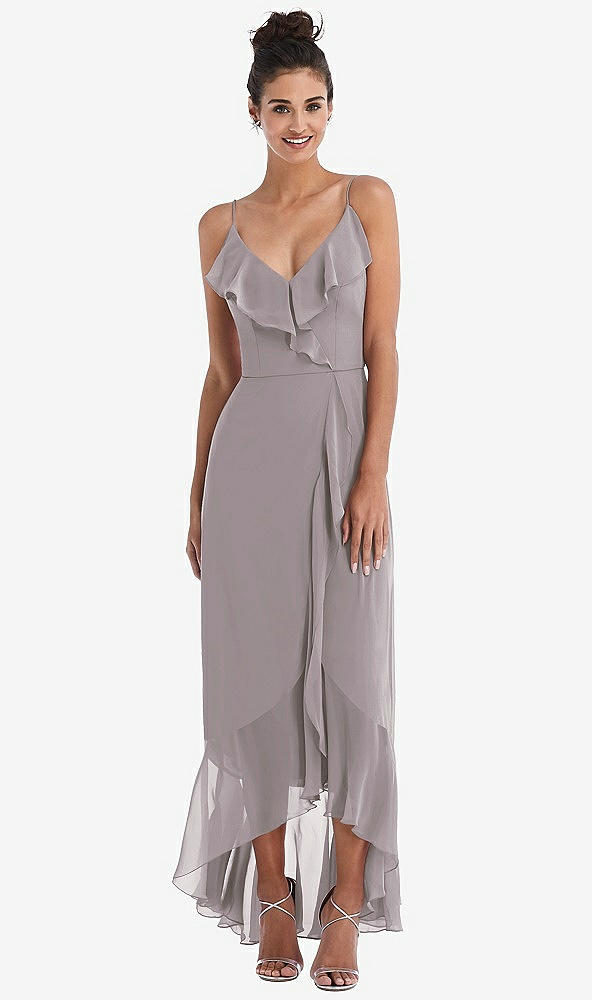 Front View Thumbnail - Cashmere Gray Ruffle-Trimmed V-Neck High Low Wrap Dress