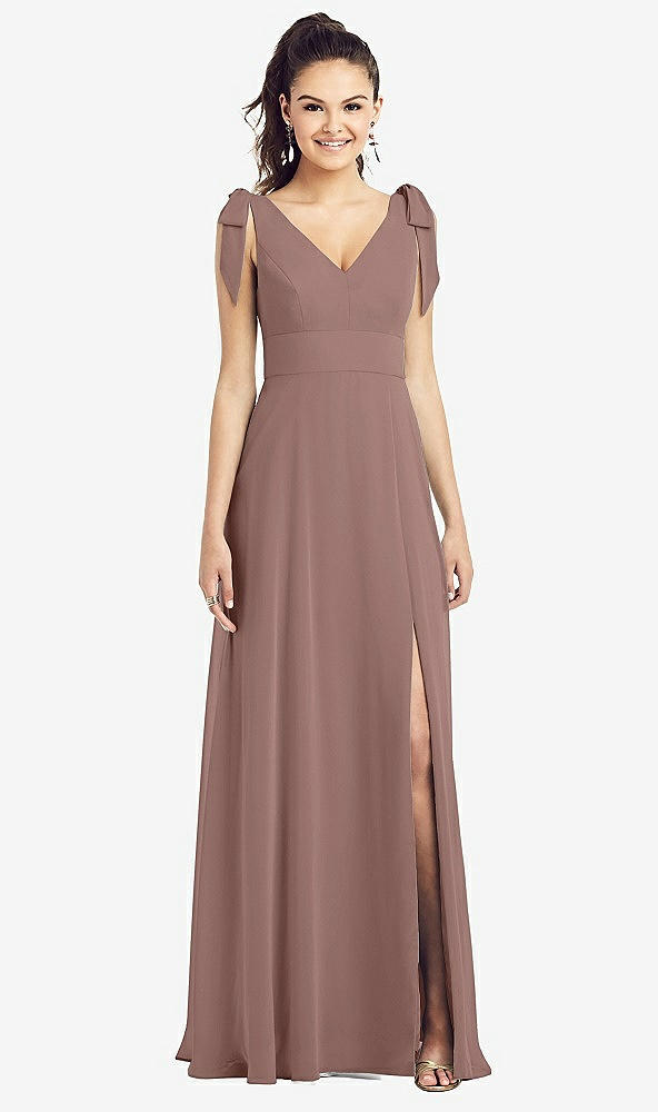 Bow-Shoulder V-Back Chiffon Gown with Front Slit in Sienna