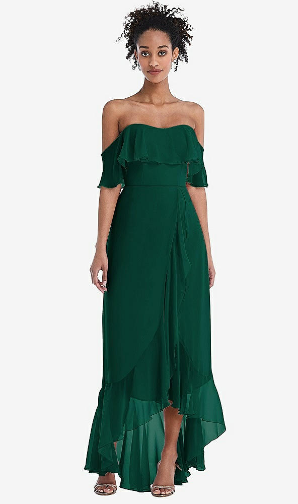 Front View - Hunter Green Off-the-Shoulder Ruffled High Low Maxi Dress
