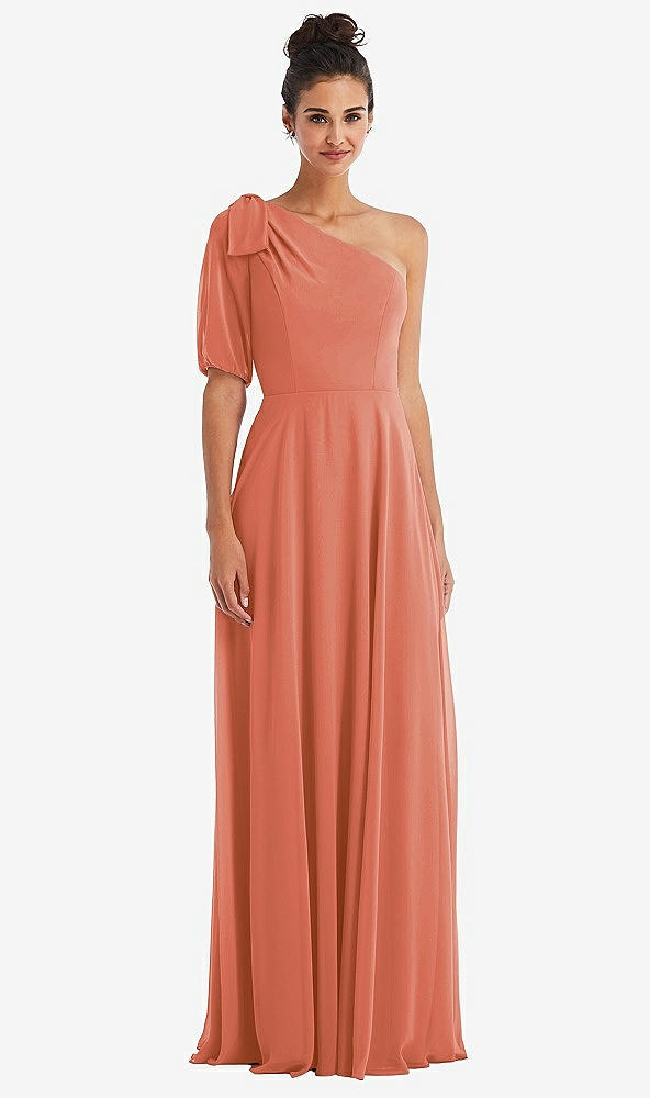 Front View - Terracotta Copper Bow One-Shoulder Flounce Sleeve Maxi Dress