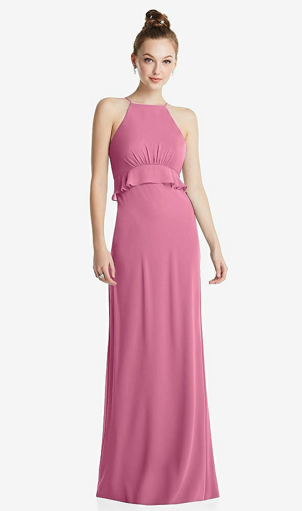 Bias Ruffle Empire Waist Halter Maxi Dress with Adjustable Straps in Orchid Pink