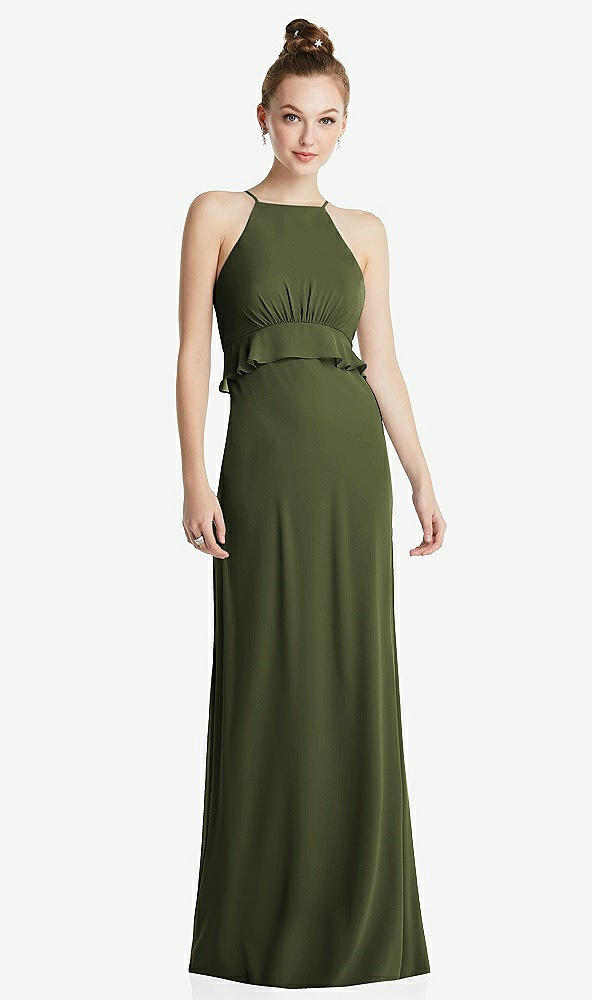 Bias Ruffle Empire Waist Halter Maxi Dress with Adjustable Straps in Olive Green