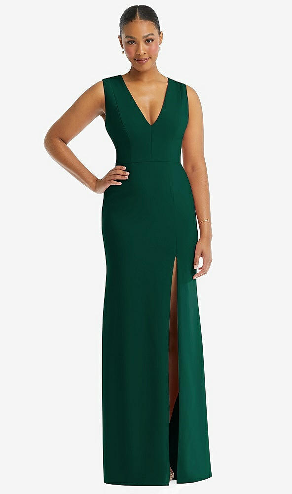 Front View Thumbnail - Hunter Green Deep V-Neck Closed Back Crepe Trumpet Gown with Front Slit