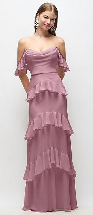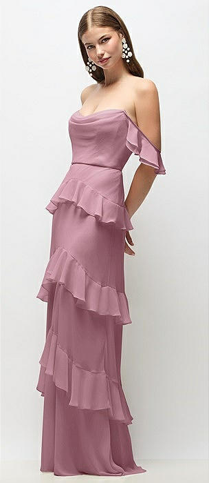 Off-the-Shoulder Cowl Chiffon Tiered Ruffle Maxi Dress with Convertible Ruffle Straps in dusty pink