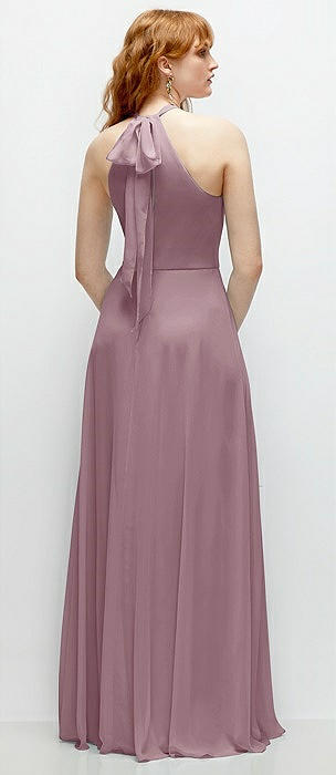Shirred Halter Chiffon Maxi Dress with Back Sash-Tie Closure
