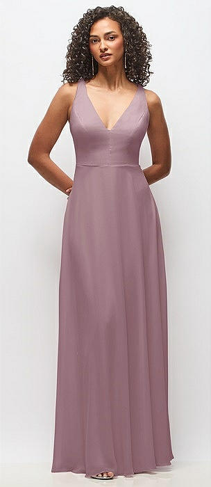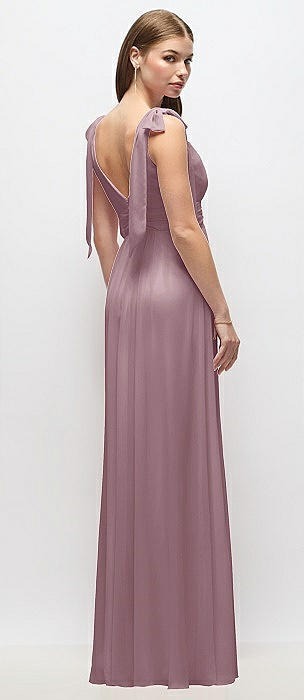 Plunge Neckline Bow Shoulder Empire Waist Chiffon Maxi Dress in dusty rose