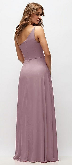 One-Shoulder Chiffon Maxi Dress with Shirred Front Slit in dusty rose
