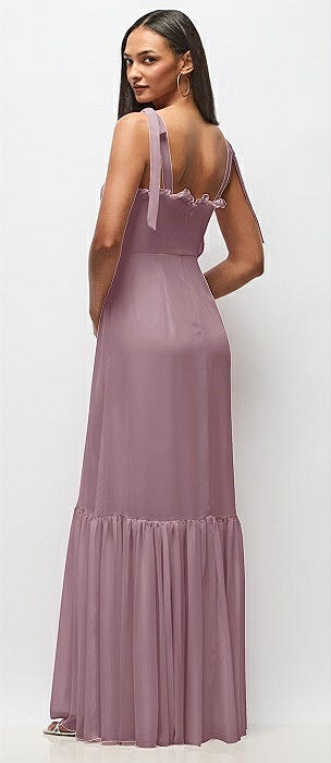 Tie-Shoulder Bustier Bodice Ruffle-Hem Maxi Dress in dusty rose